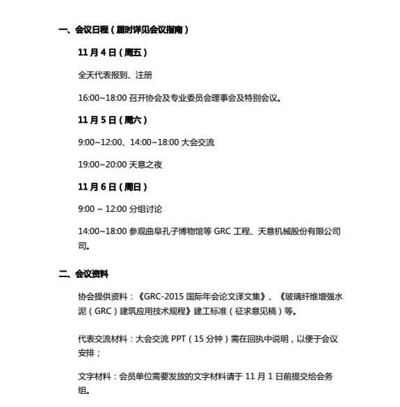2014 年南京年會以來的新技術(shù)、新材料和新裝備成果;展示上海迪士尼GRC 典型示范工程風(fēng)采;研討 GRC 技術(shù)與產(chǎn)品研發(fā)方向;匯報 2015 年迪拜國際 GRC 年會及國際 GRC 發(fā)展方向;介紹《玻璃纖維增強(qiáng)水泥(GRC)建筑應(yīng)用技術(shù)規(guī)程》建工標(biāo)準(zhǔn)制定情況;觀摩曲阜孔子博物館等 GRC 工程。為滿足與會者的要求,大會還將特邀相關(guān)部門專家作裝配式建筑發(fā)展導(dǎo)向性報告。
