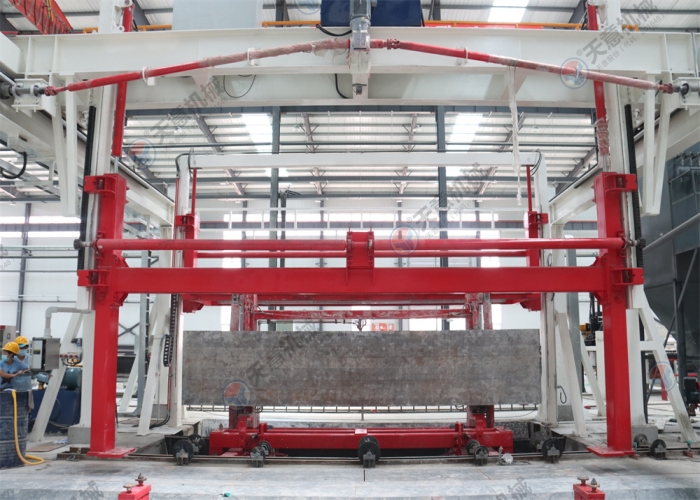 當(dāng)砌塊的強(qiáng)度達(dá)到可進(jìn)行切割時(shí), 加氣混凝土便開(kāi)始脫模。脫模后的砌塊被運(yùn)送到切割線(xiàn)上。在切割線(xiàn)上, 加氣混凝土先經(jīng)過(guò)校準(zhǔn) 、整形, 而后進(jìn)行縱向切割和橫向切割。  榫口、凹槽和手持孔的切割在坯體進(jìn)行蒸壓前處理完成,這樣就無(wú)需摩削硬化后的 加氣混凝土成品了,從而節(jié)約成產(chǎn)成本,這也是我們“零工藝廢料”概念的一部分。